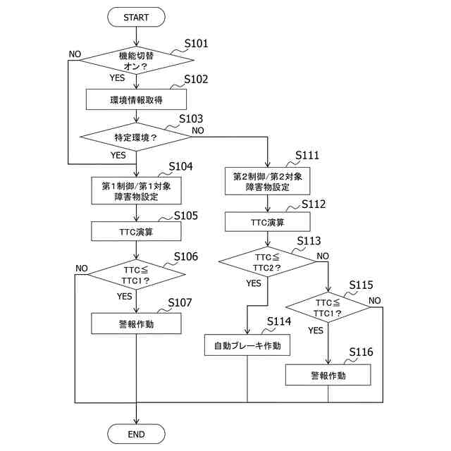 上述した特許文献1に記載された保護制御装置においては、物体が特定物体であるか否か、および降雨または霧を含む阻害環境が発生しているか否かに基づいて、衝突判定閾値を変更している。車両と障害物との衝突が予測される場合に衝突被害軽減ブレーキ制御を実行するシステムにおいても、車両周囲の環境を考慮して制御を行うことが望ましい。例えば、車両の周囲に四輪車、二輪車、および歩行者を含む複数種類の障害物が入り乱れて存在している環境では、前方障害物を対象とした自動ブレーキ制御を実行することによって車両が減速し、後続車から追突されてしまう可能性がある。この場合、システムに対する信頼性や安全性が低下してしまう。一方、車両の周囲に存在する障害物が少ない環境では、障害物との衝突可能性がある場合に確実に自動ブレーキ制御を実行することが望まれる。すなわち、車両周囲の環境に応じて、システムによる安全性および信頼性を高めて適切に自動ブレーキ制御を実行することが望まれている。