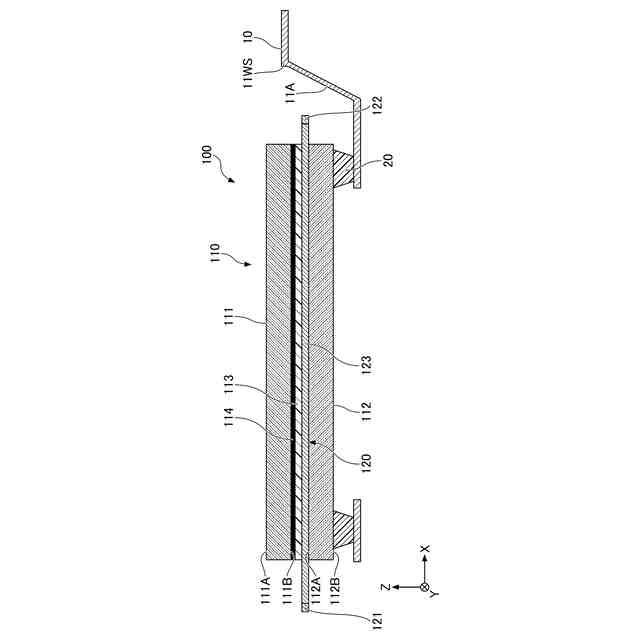 一方の端部である第1端部と、他方の端部である第2端部と、前記第1端部及び前記第2端部の間の第1中間延在部とを有する第1フラットハーネスであって、前記第1中間延在部は前記第1ガラス板及び前記第2ガラス板の間に配置され、前記第1端部は前記第1ガラス板及び前記第2ガラス板の間又は外側に位置し、前記第2端部は前記第1ガラス板及び前記第2ガラス板の外側に位置する第1フラットハーネスと、