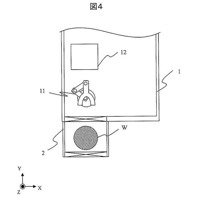 LC2内の真空排気が終了し、真空内ウェハ搬送ロボット11がアームを伸ばしてウェハWを取りに行く様子を示す。