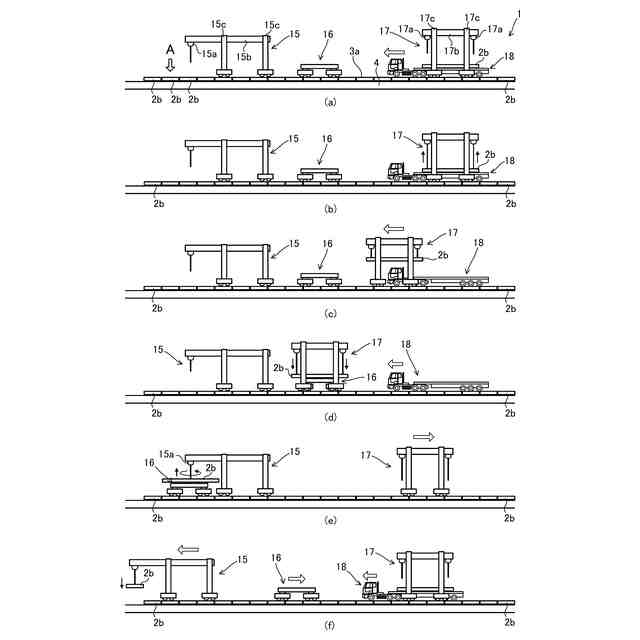 一般的に床版架設作業は、少なくとも一車線を通行止めとして行われることから、より早く作業が完了することが求められている。床版架設作業は、設置された床版間にコンクリートを打設し床版を橋軸方向において連結させることによりほぼ完了した状態となるが、特許文献1に記載されるような床版架設方法では、設置された床版上に、床版を搬送する搬送台車や床版を揚重する揚重台車が走行するレールが設置されるため、レールの撤去作業が完了するまでは床版間にコンクリートを打設し養生させることができないことから、床版架設に要する作業時間をさらに短縮し、作業コストを低減させることが困難である。
