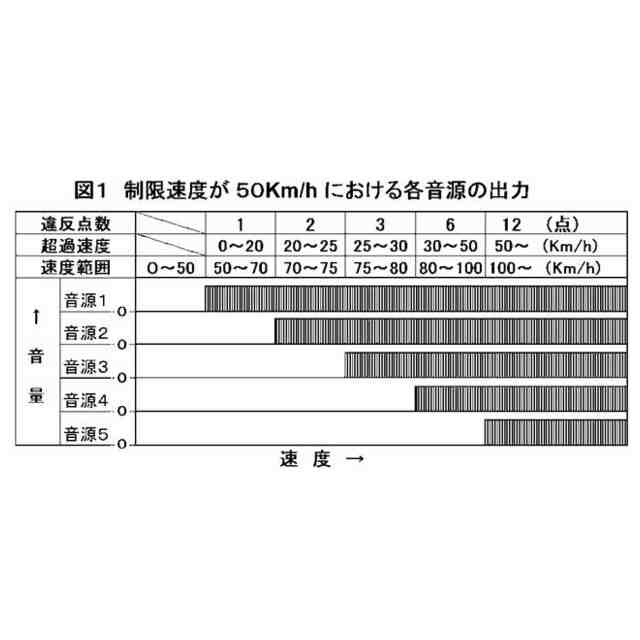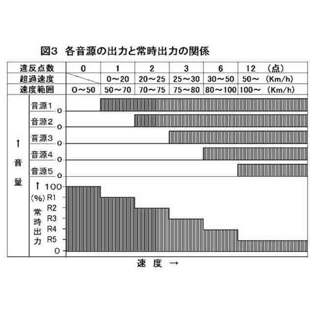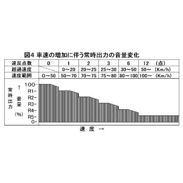 これとは別に、車速が次の違反点数(速度範囲)に近づくと、その少し前の車速から常時出力の音量が線形あるいは非線形に減少する速度範囲内の音量の部分的な減衰を利用すると、減衰が起こり始めることで、違反点数の増加が近づいていることが理解でき、運転者が車速の増加を抑制させるかどうか判断させる切欠を作ることが可能になる。