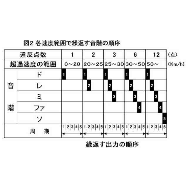 道路には上り下りの坂道があるため、慎重に走行しても制限速度を多少上回ることがあることは仕方がないことである。こうした軽微な速度違反の際には、常時出力を聞きにくくするほど音速度計の出力を際立たせる必要がない。その点、本発明では常時出力の音量を速度範囲の段階が上昇するに伴い低下させるようにしているので、その低い速度の把握に対しては、必要以上に常時出力の音量の低下を起こさない効果がある。これにより、軽微な限速度違反の際には多少の違反を起こしても、その違反速度範囲での走行を薄っすらと認識にするが、常時出力を聴きにくくするほどその出力を低下させることが無い状態で使用可能である。