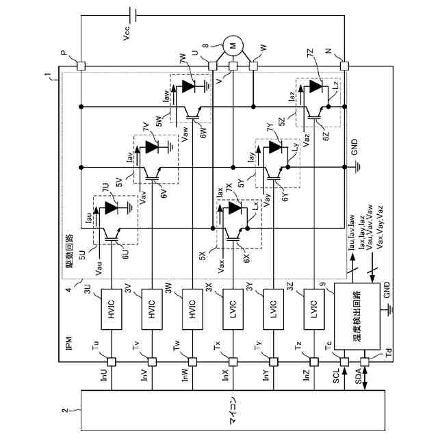 本実施形態のパワーモジュール1は、マイコン2からの指示に基づいて、負荷である3相モータ8を駆動する半導体モジュール、すなわち、IPMである。パワーモジュール1は、HVIC3U,3V,3W、LVIC3X,3Y,3Z、駆動回路4、温度検出回路9、及び端子Tu,Tv,Tw,Tx,Ty,Tz,Tc,Td,P,N,U,V,Wを含んで構成される。