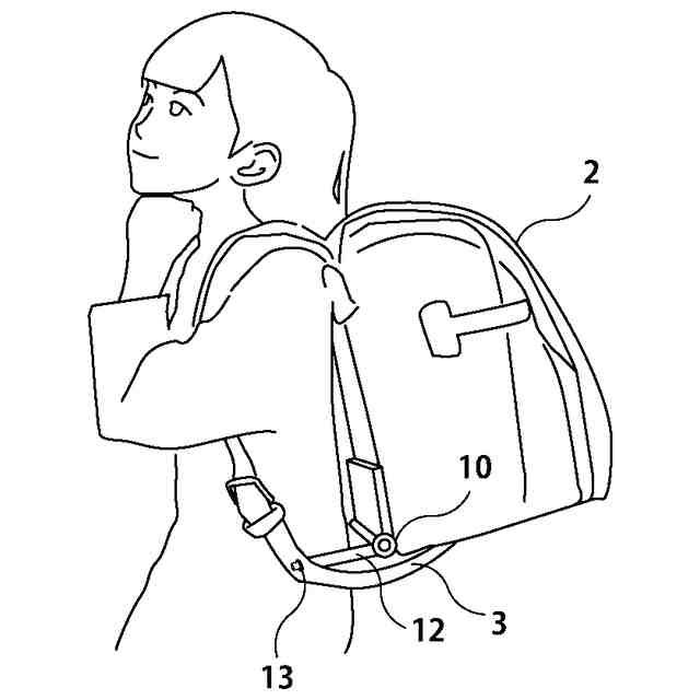 荷物の体感重量軽減について実用新案に登録された特許文献1実用新案登録第3186156号公報では、近年ランドセルにおいて軽量化、荷重の分散化、重心位置の調整といった工夫がなされてはいるものの、ランドセル自体が収納力向上のため大容量化されている現状に鑑み提案されている。ランドセル大容量化の弊害は、歩く、走る等児童が活発に動く度に収納物が大きく揺れてしまい体感重量の負担が増してしまう点である。この文献1ではランドセル内部底面に傾斜をつけ内部の教材等が背面側に倒れることで揺れが減少し、重心は背面側に寄るため体感重量を軽減できる技術思想が開示されている。しかし、内部に傾斜をつけると教材や道具を収納する際に収納物の形や分量に応じて工夫が必要になり、小さな学年では真っ直ぐに入らないことに戸惑いの懸念が生じかねない。これについてはランドセルに限らず背負い型荷物全般に共通する懸念である。