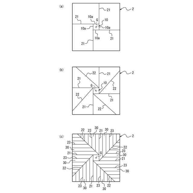 前記周方向に隣り合う一対の前記第1折曲げ部の間に1本の前記第2折曲げ部のみが設けられている場合には、それぞれの前記第1折曲げ部と前記第2折曲げ部との間に設けられて前記第1折曲げ部と前記第2折曲げ部との交点から前記第1折曲げ部と前記第2折曲げ部との間の角度を等分するように前記第3折曲げ部にまで延び、前記周方向に隣り合う一対の前記第1折曲げ部の間に複数本の前記第2折曲げ部が設けられている場合には、それぞれの前記第1折曲げ部と前記第2折曲げ部との間においては前記第1折曲げ部と前記第2折曲げ部との交点から前記第1折曲げ部と前記第2折曲げ部との間の角度を等分するように前記第3折曲げ部にまで延び、隣り合う一対の前記第2折曲げ部の間においては隣り合う一対の前記第2折曲げ部の交点から隣り合う一対の前記第2折曲げ部の間の角度を等分するように前記第3折曲げ部にまで延びる複数本の第4折曲げ部と、