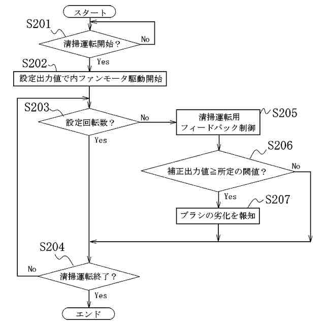 また、請求項2では、前記制御装置は、前記清掃運転の実施時における前記補正出力値が予め定められた所定の閾値を下回ったか否かを判定する判定部と、外部に前記ブラシの交換を促す報知部とを備え、前記補正出力値が前記所定の閾値を下回ったと前記判定部が判定した場合、前記報知部で前記ブラシの交換を促す報知をおこなうようにした。