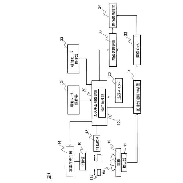 実施形態1のX線透視撮像装置について、図1~5を用いて説明する。図1は、実施形態1のX線透視撮像装置の全体構成を示すブロック図であり、図2は、照射レート操作器の表示を示す図であり、図3は、補間モード操作器の表示を示す図であり、図4は、補間モード(表示レート一定)の動作を説明する図であり、図5は、X線透視撮像装置の動作を示すフローチャートである。