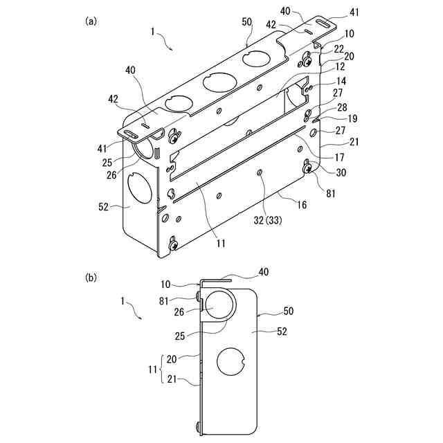建物の間仕切壁や洗面化粧台、OAデスク等の壁面には照明器具のスイッチやコンセント等の配線器具が設置されており、その設置について、特許文献1に記載のボックスカバーが開示されている。このボックスカバーは、図14(a)に示すように、配線器具が取り付けられる本体部91と、本体部91を構造物である建物の柱や胴縁に固定する固定部92と、を備えており、図14(b)に示すように、配線ボックス50に組付けられて配線ボックス50の開口を覆っている。ボックスカバー90は、本体部91に、配線器具が取り付けられる透孔93が形成され、透孔93の突起片に設けられた取付部94に、配線器具を保持する配線器具取付枠が取り付けられて、配線器具が設置されるようになっている。