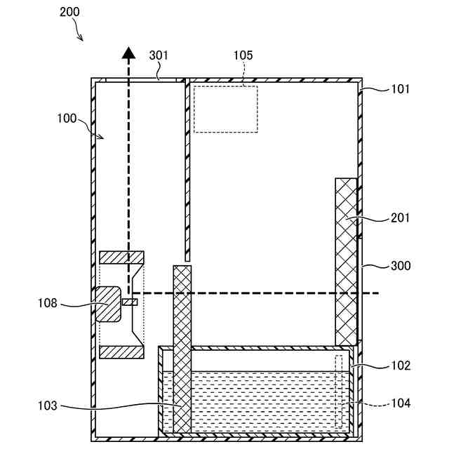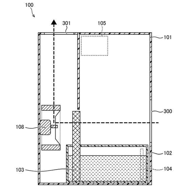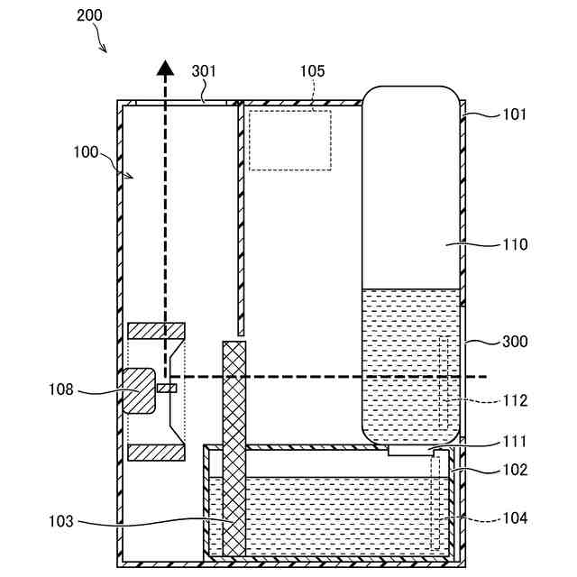 図1は、本開示に係る加湿装置100の内部構造を示す概略断面図である。加湿装置100は本体101を有し、本体101の内部に貯水部102、加湿部103、水位センサー104、制御部105等が収容されている。本体101は筐体であり、筐体で囲まれた内部空間を有する。図示しないが、本体101の筐体の一部分は着脱可能にされており、取り外すことで内部空間の各構成に接触することができる。