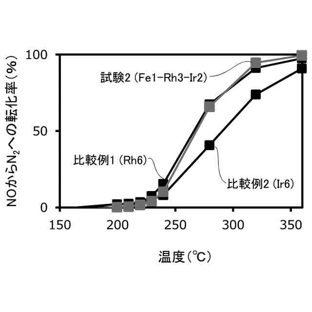 比較例1及び2、並びに試験2の排ガス浄化用触媒のNO-CO反応における反応温度と触媒活性との関係を示すグラフである。図中、横軸は、測定時の温度(℃)であり、縦軸は、NOからN