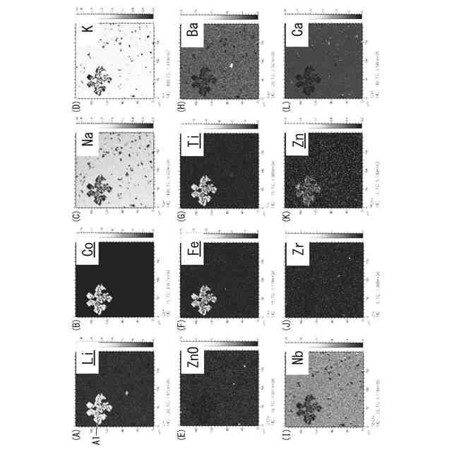 図4は、実施例1~4に対応する、Liを含む測定サンプルの表面のうち、主にKNN相とタングステンブロンズ相とが存在する領域に対する、飛行時間二次イオン質量分析によるイオンのマッピング測定結果を示す図である。