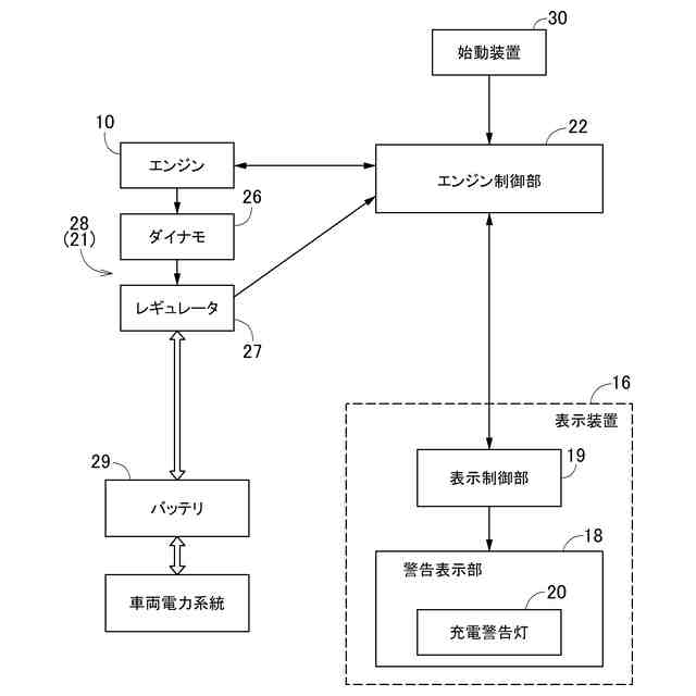 前記発電部が、交流発電機と整流システムとが一体的に形成された整流システム一体型発電装置であるときは、前記発電信号が前記表示制御部に送信され、前記表示制御部が前記発電信号に基づいて前記警告表示器を作動させるように構成され、