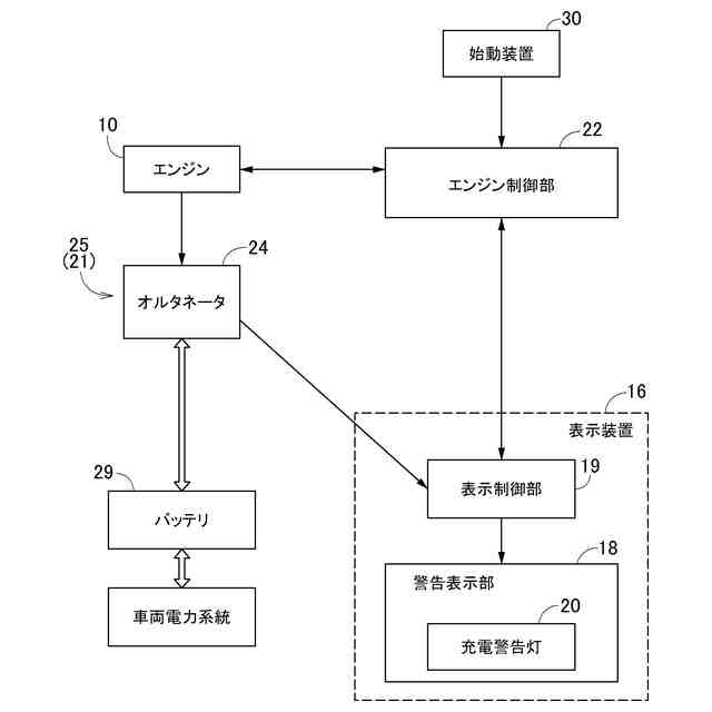 又、整流システム一体型発電装置(オルタネータ)を用いる構成では、例えば、特許文献2に記載されるように、オルタネータの検出信号が、運転部に備えられた表示装置の作動を制御する表示制御部に入力され、表示制御部がエンジンの異常等を表示する警告表示器を作動させる構成となっている。