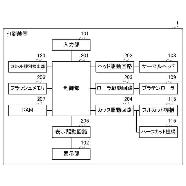 図1に示すように、印刷装置1は、筐体100と、入力部101と、表示部102と、開閉蓋103と、開閉蓋103によって覆われるテープ収納部104と、を備える。筐体100には、外部に露出する入力部101と、表示部102と、開閉蓋103と、が形成され、内部にテープ収納部104を含む。筐体100は、PC(Personal Computer)、スマートフォンを含む外部機器と接続する接続端子と、フレキシブルディスク、CD-ROM、DVD-ROM、メモリカードを含む記憶媒体が挿入される挿入口と、電源コードが接続される電源端子と、を含み得るが、それらの図示は省略する。