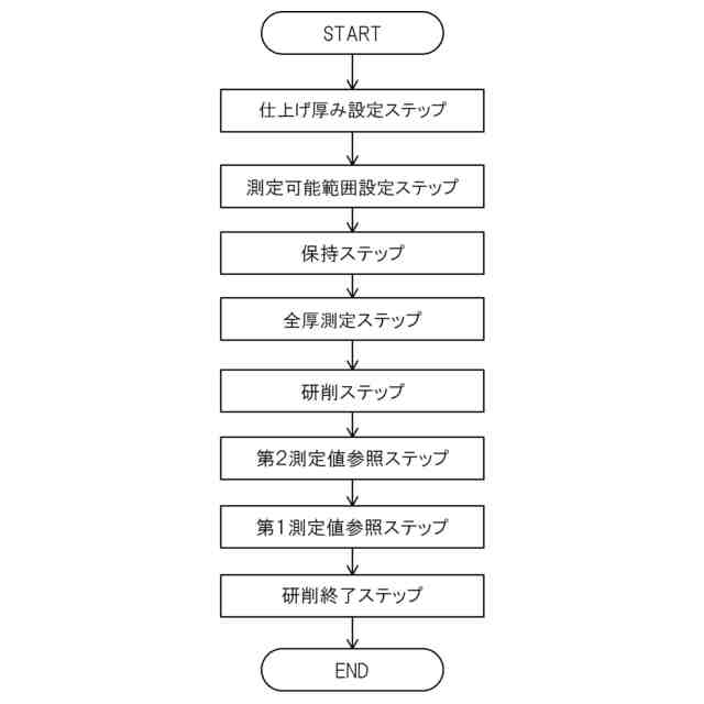 研削ステップにおいて、該第2測定値が測定可能範囲の下限値を下回った時点で該第1測定器による第1測定値を参照する第1測定値参照ステップと、