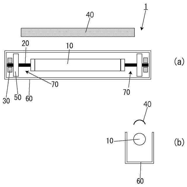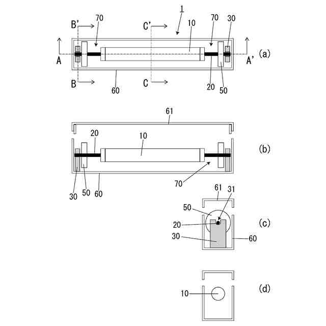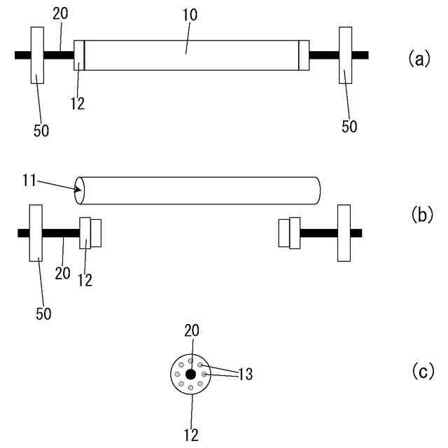 図3に示すように心棒20はバー10の左右両端から軸方向に突出する部材である。本実施の形態ではバー10の端部開口11を塞ぐ蓋体12に心棒20を取り付けている。図3(b)に示すように蓋体12がバー10から外れるようにすることで心棒20はバー10に対して脱着自在になっている。蓋体12がバー10から外れないようにしてもよい。