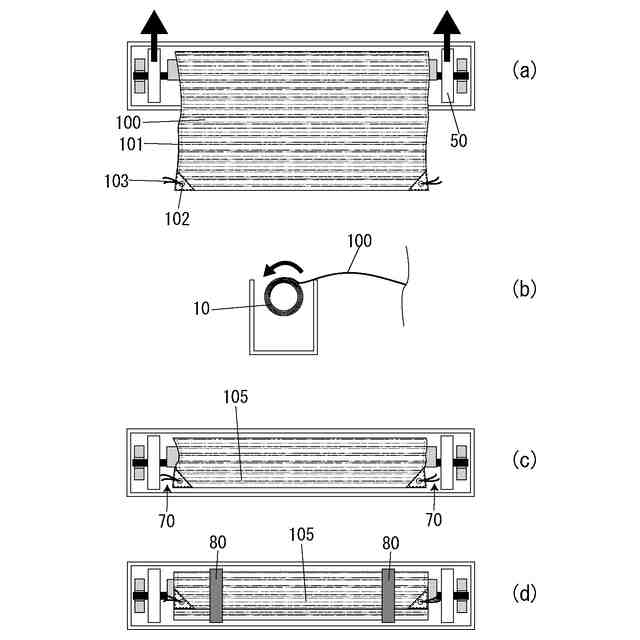 シート保管具の使用方法を示す平面図(a)、断面図(b)、平面図(c)及び(d)