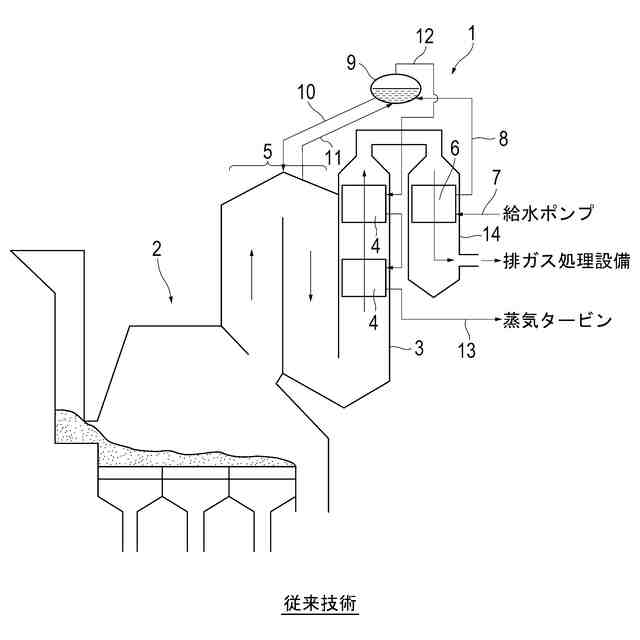 給水は、給水ポンプから節炭器給水管7を経て節炭器6に供給され、予熱された後、ドラム給水管8を経てボイラドラム9(以下、単にドラム9という)に供給される。ドラム9に供給された給水は、降水管10、蒸発器5、蒸発管11、ドラム9の順で自然循環又は強制循環し、その間に加熱される。加熱により発生した蒸気は、ドラム9で水と分離された後、ドラム蒸気管12を経て過熱器4に送られ、ここでさらに昇温された後、蒸気管13を経て蒸気タービンに供給され、発電等に利用される。