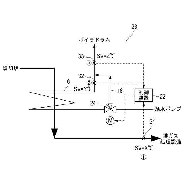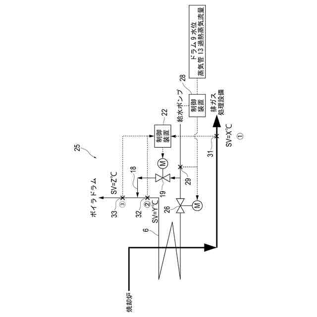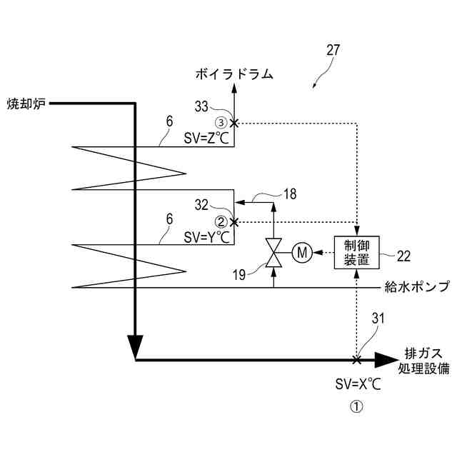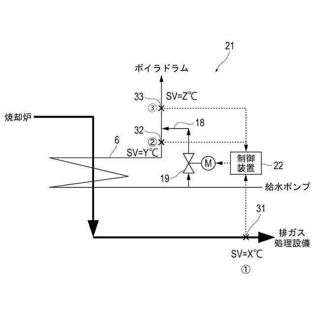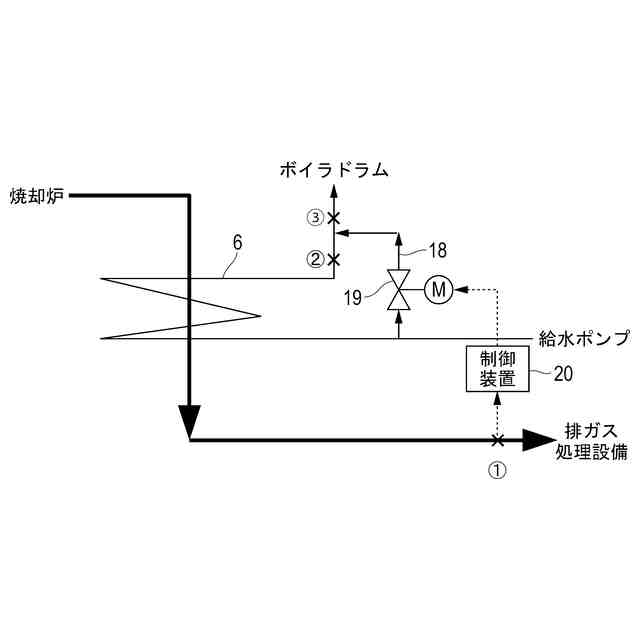 上記バイパスダクトの課題を解決するために、図3に示すように節炭器6への給水をバイパスするバイパス経路18を設け、バイパス経路18に調節弁等の給水量調節装置19を設けることが考えられる。そして、軽負荷時に節炭器6通過後の排ガス温度(1)が下がったら、制御装置20と給水量調節装置19によって給水がバイパス経路18に流れるようにすることで、節炭器6通過後の排ガス温度を上昇させる。これにより、節炭器6及びその下流機器(排ガス処理設備)の低温腐食を防止することができ、負荷の幅広い範囲でボイラ1の運転を確保することができる。