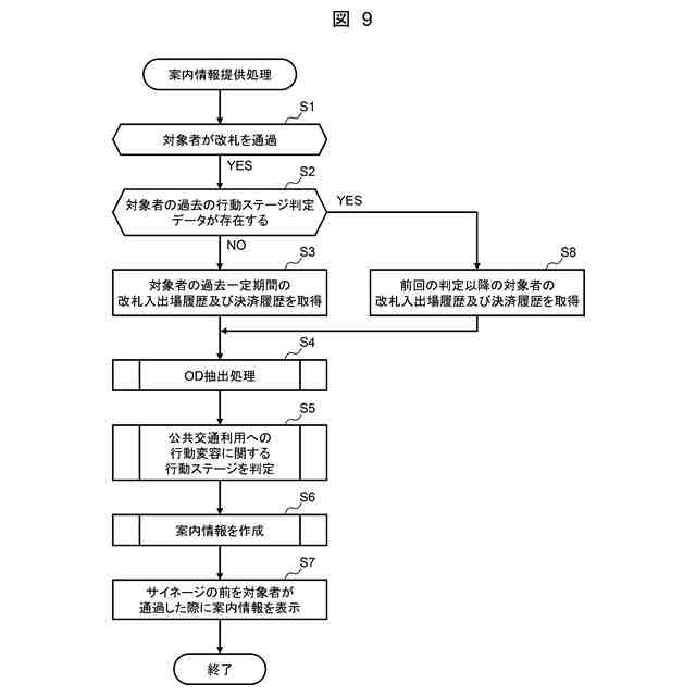 また、本発明においては、自動車移動実績抽出部が、対象者の移動に伴って記憶部に記憶される履歴データから、前記対象者が特定区間において公共交通移動経路以外の経路を利用した実績を表す自動車移動実績を抽出する自動車移動実績抽出ステップと、代替公共交通確認部が、前記特定区間において代替可能な公共交通移動経路を探索する代替公共交通確認ステップと、行動ステージ判定部が、前記特定区間において前記対象者が前記公共交通移動経路を利用した実績を表す公共交通移動実績と、前記自動車移動実績との割合に基づき、前記対象者の行動が分類されるべき行動ステージを判定する行動ステージ判定ステップと、案内情報生成部が、前記行動ステージに応じて、行動変容への行動阻害要因を除去するための案内内容とした案内情報を作成して前記記憶部に記憶し、前記特定区間のいずれかの位置に配置された表示体に出力する案内情報生成ステップと、を有し、前記行動ステージ判定ステップでは、前記行動ステージ判定部が、前記案内情報の出力後、再度、前記案内情報の出力後における前記対象者の移動に伴って前記記憶部に記憶される履歴データに基づいて、前記案内情報に接した前記対象者の行動変容に応じた行動ステージを判定し、前記案内情報生成ステップでは、前記案内情報生成部が、前記行動ステージの変動の有無に応じて次に出力する案内情報の案内内容を変更するようにした。