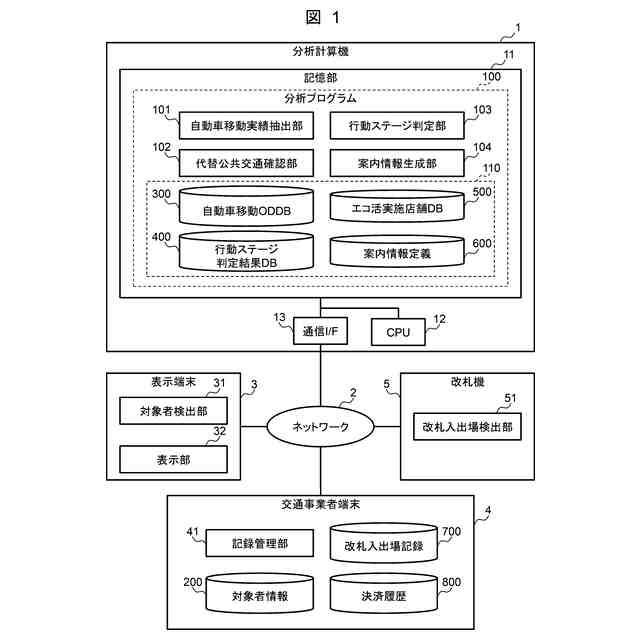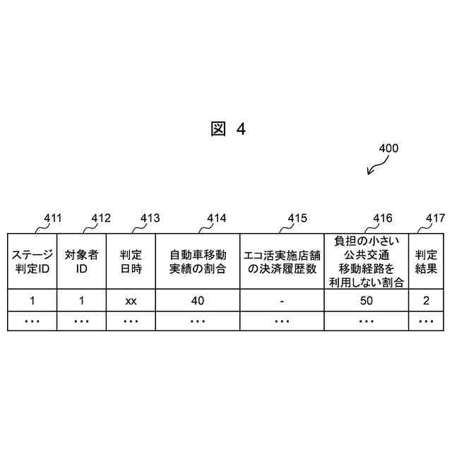 代替可能な公共交通移動経路のある自動車移動特定区間における公共交通と自動車の移動実績の割合と、負担の小さい公共交通移動経路がある自動車移動特定区間における負担の小さい公共交通と自動車の移動実績の割合と、環境に優しい取り組みを実施している店舗での決済履歴の有無から、前記対象者の行動ステージを特定する