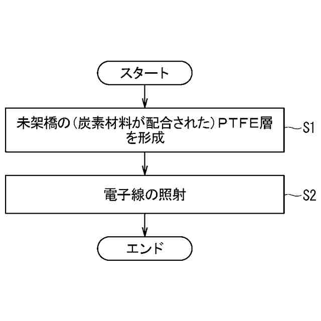 ポリテトラフルオロエチレンまたはテトラフルオロエチレンとパーフルオロアルキルビニルエーテルとの共重合体に炭素材料が配合された状態で、電子線が照射される、