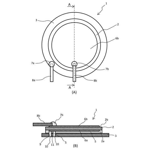 図1(A)は本発明の第1の実施形態の圧電振動板1を示す平面図であり、図1(B)は図1(A)のA-A線断面図である。図2(A)は両面に電極6a,6bが設けられた圧電素子2を示す平面図であり、図2(B)は図2(A)のA-A線断面図である。図3(A)は2種類の接着材4,5が塗布された金属板3を示す平面図であり、図3(B)は図3(A)のA-A線断面図である。図4(A)は圧電素子2と金属板3とが接合された状態を示す平面図であり、図4(B)は図4(A)のA-A線断面図である。本実施形態の圧電振動板1は、圧電素子2と、圧電素子2が積層されている金属板3と、を含む。圧電素子2は例えば圧電セラミックからなり、両面2a,2bにそれぞれ銀ペースト等の導電性ペーストからなる電極6a,6bが設けられている。圧電素子2の一方の面(裏面)2aに設けられた電極6aおよびその周囲の面2aが金属板3に接着されている。金属板3と、圧電素子2の他方の面(表面)2bに設けられた電極6bとに、それぞれはんだ7a,7bによってリード8a,8bが接続されている。はんだ付けは、はんだごて12(図10,15参照)またはレーザー等を用いて行われる。