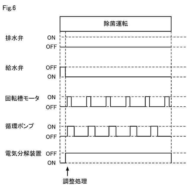 第1実施形態による洗濯機の除菌運転における各構成の動作を示すタイミングチャートの一例