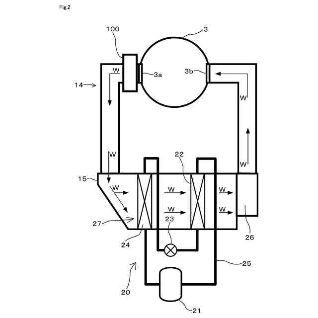 洗濯乾燥機1は、その外郭を構成する矩形箱状の外箱2の内部に衣類処理槽3を備えている。衣類処理槽3は、水槽3sおよびドラム3dを備えている。水槽3sは、図示しないサスペンションにより弾性的に支持されている。水槽3sは、円筒状をなし、その周壁面および背面が閉塞されており、内部に水を溜めることが可能である。ドラム3dは、水槽3s内において回転可能に設けられている。ドラム3dは、円筒状をなし、その周側面および背面が概ね閉塞されている。ドラム3dは、例えば洗い処理、すすぎ処理、脱水処理、乾燥処理などといった各種の処理の対象である図示しない衣類を収容可能である。ドラム3dの周壁面および背面には、通気および通水が可能な図示しない多数の小孔が設けられている。ドラム3dの内周面には、衣類をかき上げるための図示しない複数のバッフルが設けられている。ドラム3dの回転中心軸は、水平方向あるいは水平方向に対して傾斜する方向に延びている。衣類処理槽3は、衣類が収容される衣類収容槽の一例として機能する。