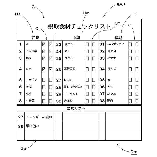即ち、保育園等において、入園した乳幼児等における食材の好き嫌いやアレルギーの有無等に関しては、個々人のプライバシーや性質に関連するため、正確な把握は容易でない。結局、乳幼児等の情報が不十分な場合、給食やおやつ等を食べた結果に基づいて確認する以外になく、前述のように、意図せぬトラブルを招いたり、人命に係わる事態を招く虞れがあった。