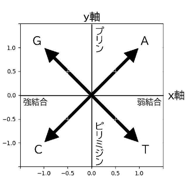 発明の詳細な説明【技術分野】 【0001】 本発明は、ゲノム配列の数値表現、類似性評価および可視化に関係する。 続きを表示(約 3,600 文字)【背景技術】 【0002】 DNAは4種の塩基の配列であり、塩基配列を符号化したゲノム配列は一般にATGCの4種の文字列として表現される。その文字列は、文字が不規則に並んでおり、人間が判読することは難しい。例えば、複数のゲノム配列があった場合、どこがどれだけ異なるのかあるいは似ているのか、人間が判読することは難しい。そのため、ゲノム配列の解析は、コンピュータによる文字列解析あるいは数値解析が行われる。例えば、多数のゲノム配列データから類似するゲノム配列を収集し、動的計画法による塩基の変異(置換、欠失、挿入)の推定などが行われる。類似するゲノム配列の収集にあたり、類似性評価が重要となるが、ゲノム配列の文字列の先頭からの一致率のみでは塩基の変異の影響を強く受け、同種の配列であっても類似性を正しく評価できない。そのため、塩基の変異についての事前情報がない状況において、変異の影響を小さく抑えて、類似性を評価する方法が必要となる。なお、ここでゲノム配列は、ゲノム全体または染色体や遺伝子などの一部の配列を指す。 【0003】 ゲノム配列はヒトの場合で全体では約30億文字分であり、染色体単位に分割しても数千万文字分のデータ量となる。ゲノム配列の大規模な調査に向けて、類似性評価の計算時間および記憶容量の増大を避ける方法が求められる。 【0004】 ゲノム配列を数値化した上で、評価関数を設定し、ゲノム配列の類似性評価を行う手法がいくつか提案されている。後記の非特許文献1に3次元ベクトルを用い、ゲノム配列を3次元データ配列に変換し、3次元グラフ(Hカーブ)の表示を行う数値化手法について記載されている。また、非特許文献2では、前記文献1とは異なる3次元ベクトルを用いて3次元グラフ(Zカーブ)の表示を可能にする数値化手法について記載されている。他にも、非特許文献3で、複数の3次元ベクトルを組合せてゲノム配列を数値化する手法が提案されている。非特許文献4では、9種類の数値化手法を取り上げ、ゲノム配列の類似性計算の評価を行っている。ゲノム配列の数値表現および類似性評価方法において、塩基の変異の影響を過度に受けないこと、計算時間および記憶容量の増大を避けること、双方を満たす標準となる手法はない。 【先行技術文献】 【非特許文献】 【0005】 Eugene Hamori and John Ruskin, H Curves, A Novel Method of Representation of Nucleotide Series Especially Suited for Long DNA Sequences, THE JOURNAOLF BIOLOGICAL CHEMISTRY Vol. 258, No, 2, 1983 Chun-Ting Zhang and Ren Zhang, Analysis of distribution of bases in the coding sequences by a diagrammatic technique, Nucleic Acids Research, Vol. 19, No. 22 6313-6317 Guosen Xie, Zhongxi Mo, 3D graphical representations of DNA primary sequences based on the classifications of DNA bases and their applications, Journal ofTheoreticalBiology269(2011)123–130 Gerardo Mendizabal-Ruiz, Israel Roma Ân – Godõ Ânez, Sulema Torres-Ramos, Ricardo A. Salido-Ruiz, J. Alejandro Morales, On DNA numerical representations for genomic similarity computation, PLOS ONE (https://doi.org/10.1371/journal.pone.0173288) March 21, 2017 【発明の概要】 【発明が解決しようとする課題】 【0006】 本発明が解決しようとする課題は、ゲノム配列の類似性評価において、DNA塩基の変異の影響を軽減すること、および、計算時間と記憶容量の増大を避けることである。 【課題を解決するための手段】 【0007】 DNAは4種の塩基から成る。2次元平面は4方向(上下左右)の軸で4象限に分けられる。DNAと2次元平面のこの特性を活かし、4塩基を4軸または4象限の座標にマッピングすることで、DNAゲノム配列の数値表現が可能となる。本発明では、DNAゲノム配列のATGCの4種のコードに、以下の3つの特性を備える4種の2次元ベクトル(ここでは要素ベクトルと呼ぶ)を割り当てる。 要素ベクトルの3つの特性: (1)2次元平面上で同じ大きさをもつ (2)対向する2つのベクトルで1つの組を成し、2組がある (3)異なる組のベクトルは垂直である さらに、ゲノム配列の各要素を調査開始点からの要素ベクトルの合成ベクトルに変換する。この合成ベクトルへの変換により、1次元のゲノム配列は2次元座標のデータ配列に変換される。2つのゲノム配列に前記の変換を実施し、得られる2組の2次元データ配列間の相互相関係数を計算し、類似性評価を行う。この方式は、RNA配列(AUGCの4種の文字配列)に対しても同様に用いることができる。 【0008】 ゲノム配列を2次元ベクトルの合成ベクトルに変換することの利点は、ゲノム配列を累積的な数値表現とすることで、ゲノム配列全体の大局的な類似性評価を可能にし、DNA塩基の変異の影響を過度に受けないことである。累積的な数値表現となることから、例えば、合成ベクトルの終点の座標はゲノム配列全体を反映したものとなる。要素ベクトルの合成の軌跡について注目すると、ひとつのDNA配列を元にし、DNA塩基の変異が発現した場合、本方式による