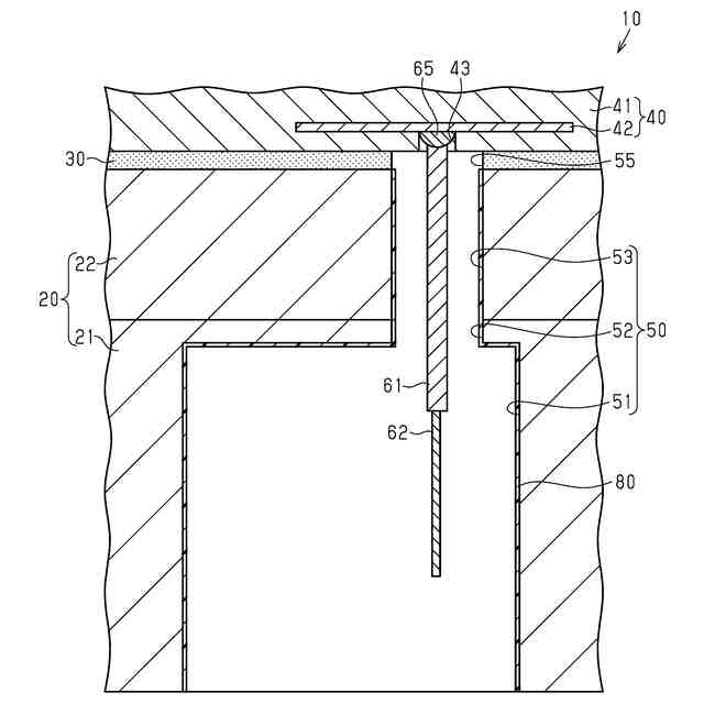 図1に示すように、基板固定装置10は、ベースプレート20と、接着層30と、静電チャック40と、貫通孔50,55と、給電端子60と、筒状絶縁部材70と、絶縁膜80とを有している。静電チャック40は、接着層30によりベースプレート20の上面に固定されている。基板固定装置10は、ベースプレート20の上面に固定された静電チャック40により吸着対象物である基板(図示略)を吸着保持する装置である。基板としては、例えば、シリコンウェハなどを挙げることができる。なお、基板の直径は、例えば、8インチ、12インチ又は18インチ程度とすることができる。