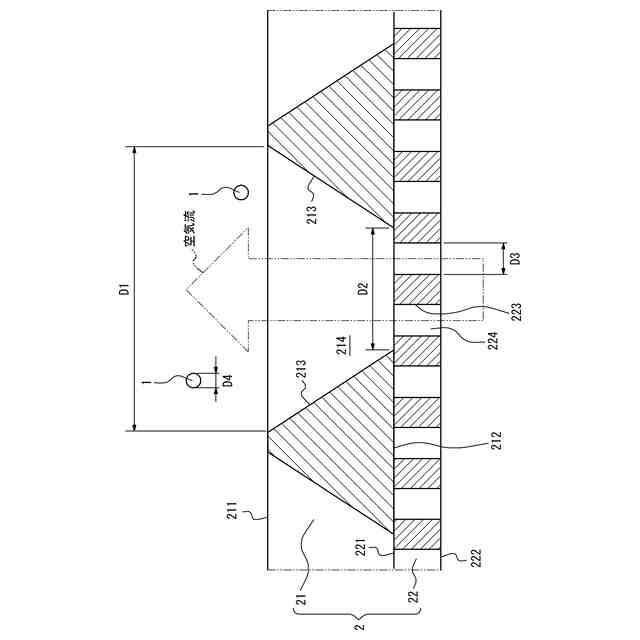(1)本開示の一実施形態に係るエアテーブル型密度分離装置は、複数の分離対象物の投入口から前記複数の分離対象物が流れる第1方向及び前記第1方向に交差する第2方向のそれぞれに向かって低くなるように傾斜する第1底板と、前記第1底板の上で前記第2方向に延在する少なくとも1枚の邪魔板とを備える。前記第1底板は、裏面から表面に向けて吹き出すガスが通過する第1孔を有する。前記第1底板の裏面における前記第1孔の径は、前記複数の分離対象物のうち少なくとも一部の分離対象物よりも大きい。前記第1底板の表面における前記第1孔の径は、前記第1底板の裏面における前記第1孔の径よりも大きい。