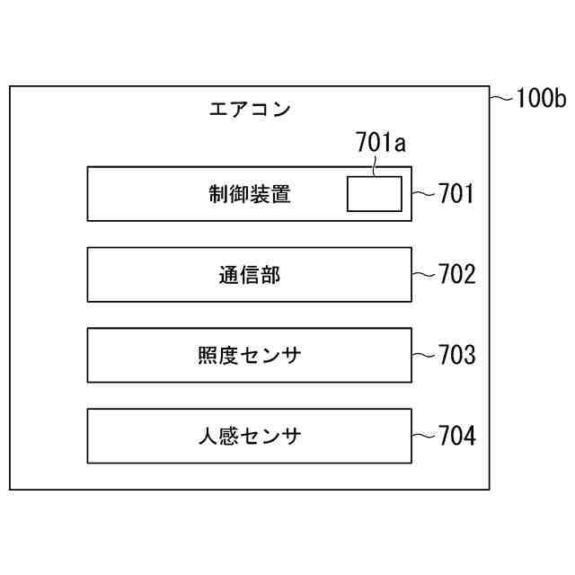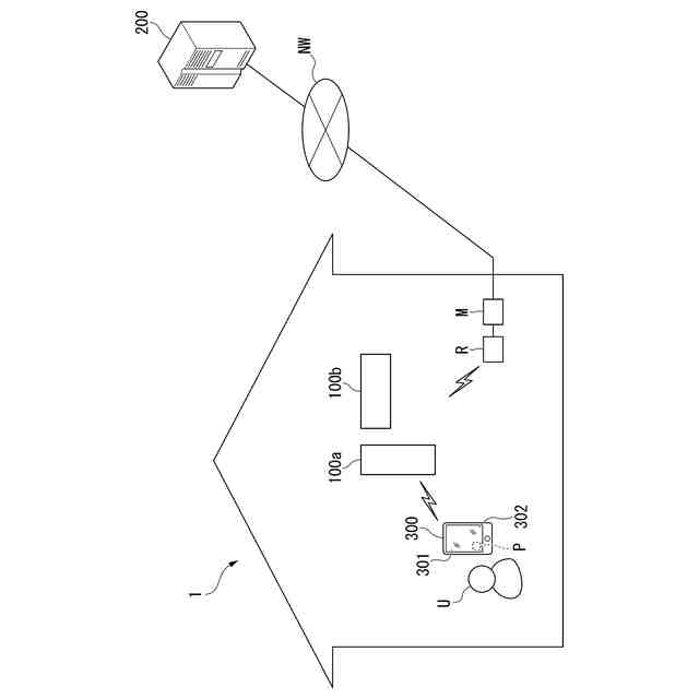 エアコン100bは、ユーザUの住居に配置される。エアコン100bは、例えば、ユーザUの住居に配置された無線ルータRおよびモデムMを介してネットワークNWと接続され、ネットワークNWを介してサーバ200と通信可能である。これにより、エアコン100bは、サーバ200を介してユーザUの端末装置300と通信可能である。本実施形態では、エアコン100bは、Bluetoothなどの近距離無線通信によって冷蔵庫100a、端末装置300のそれぞれと直接に通信可能である。冷蔵庫100a、エアコン100bの詳細については、後述する。