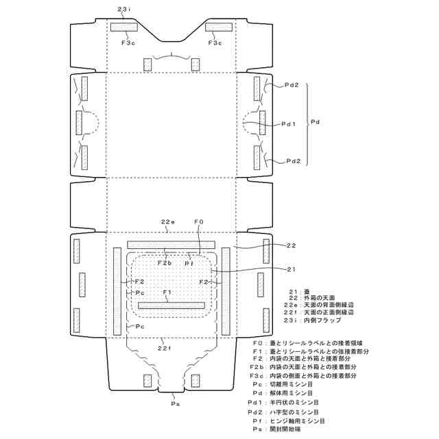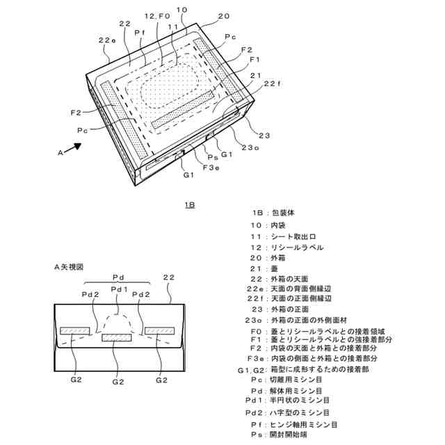 本発明者は、外箱でフィルム製の内袋を覆い、外箱の蓋の開閉により内袋のリシールラベルを開閉するにあたり、蓋とリシールラベルとを接着し、蓋の周りにおいても内袋の天面と外箱とを接着し、さらに、内袋の側面と外箱とを接着すると、内袋内のシートの枚数が減っても内袋の当初の外形が保持され易くなり、リシールラベルの密封機能が維持されることを想到し、本発明を完成させた。