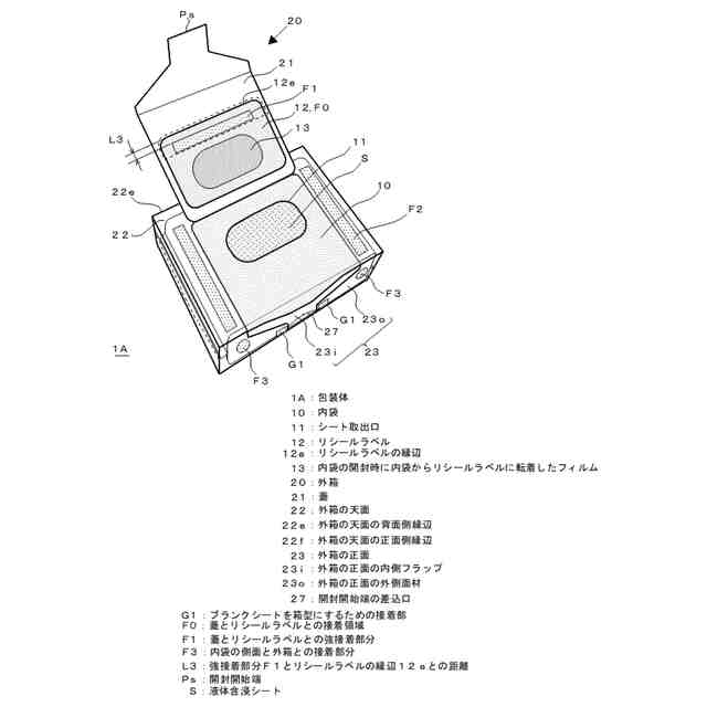 【解決手段】液体含浸シートSの積層体を収容し、液体含浸シートの取出口11が天面に開口したフィルム製の内袋10、内袋10のフィルムと再剥離可能に接着し、シート取出口11を密封するリシールラベル12、内袋10を覆う外箱20を備えた液体含浸シートの包装体1Aである。外箱20が、ミシン目の切離により開閉軸で引き起こし可能となる蓋21を有する。蓋21はリシールラベル12を覆う大きさで、開閉軸が折線により形成され、リシールラベル12と蓋21とが、リシールラベル12と内袋10との接着力よりも強く接着する。また、蓋21の外側で内袋10の天面と外箱20とが接着すると共に(接着部分F2)、内袋10の側面と外箱20とが接着している(接着部分F3)。