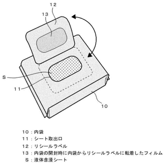 メイク落とし、クレンジング及びローション等の液体化粧料、皮膚の清浄又は殺菌用の液剤、並びにトイレ、台所等の清掃用の液剤等を不織布、ティッシュ等に含浸させた液体含浸シートの積層体をピロー袋等のフィルム製の袋に収容し、シート取出口に蓋として再剥離性の封緘フィルム(リシールラベルともいう)を設けた包装体が使用されている。
