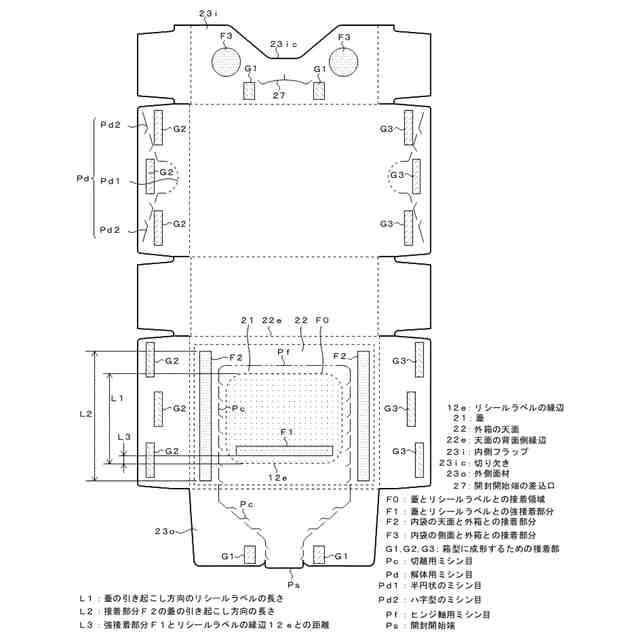 蓋はリシールラベルを覆う大きさであり、開閉軸が折線により形成され、