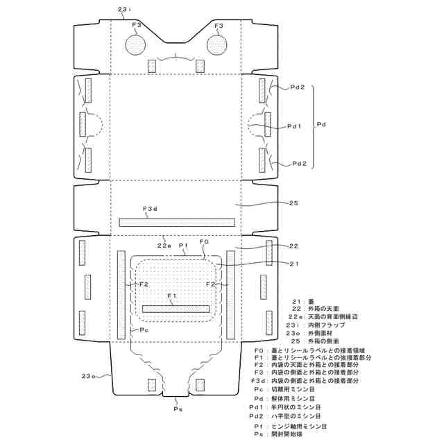 これに対し、箱の天面への切り込みにより蓋を形成したものを外箱とし、外箱でフィルム製の内袋を覆い、蓋とリシールラベルとを接着すると共に、蓋の周りでも内袋の天面と外箱とを接着し、蓋の開閉によりリシールラベルを開閉させる包装体が提案されている(特許文献1、特許文献2)。