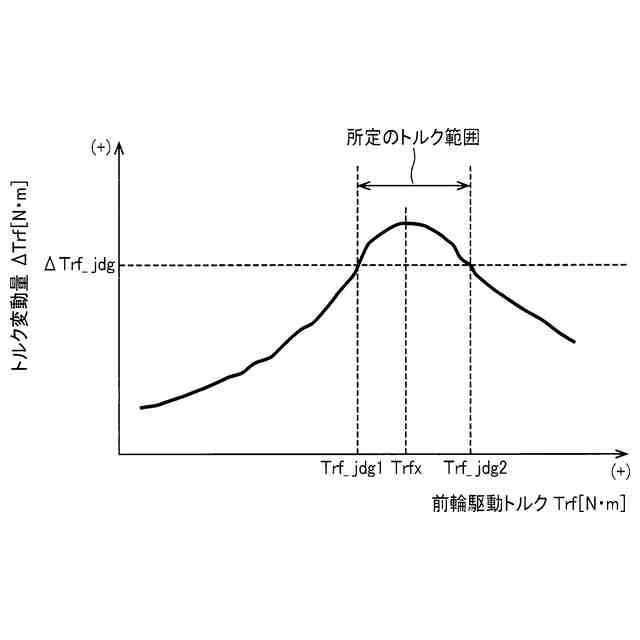 車両が所定の低速走行時且つ発進クラッチがスリップ状態である場合における、前輪駆動トルクとトルク変動量との関係を示す例である。