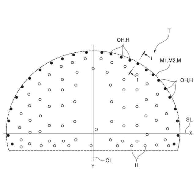 トンネル切羽に穿孔して発破するに際し、一つの装薬孔に装填された火薬によって破砕される領域は、基本的には、装薬孔の周囲の、限定的な領域となる。このため、トンネル切羽の最外周における装薬孔である最外周装薬孔が、トンネルの径方向においてより内側に位置するほど、破砕される領域の多くが設計時に予定された壁面の設計位置よりも内側に含まれ、設計位置から径方向の外側で掘削される部分が小さくなる。逆に、最外周装薬孔が、トンネルの径方向においてより外側に位置するほど、破砕される領域の多くが設計位置より外側にはみ出し、設計位置から径方向の外側で掘削される部分が大きくなる。このように、穿孔発破が行われた場合の、トンネルの径方向における、壁面の位置と、設計時に予定された設計位置との差分である、余掘り量と、最外周装薬孔の位置と、の間には、相関がある。