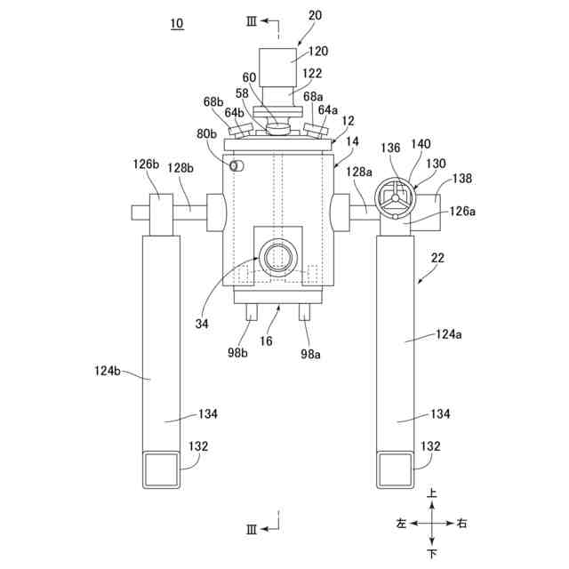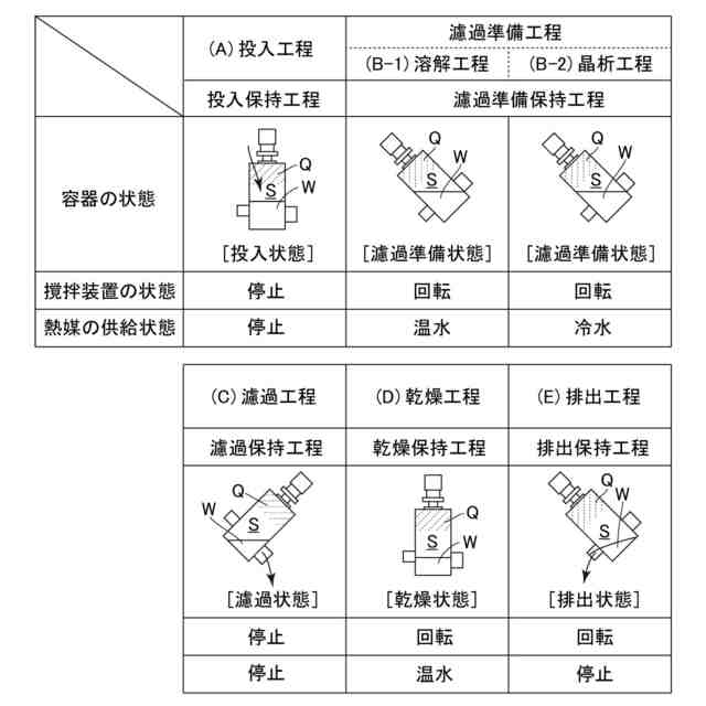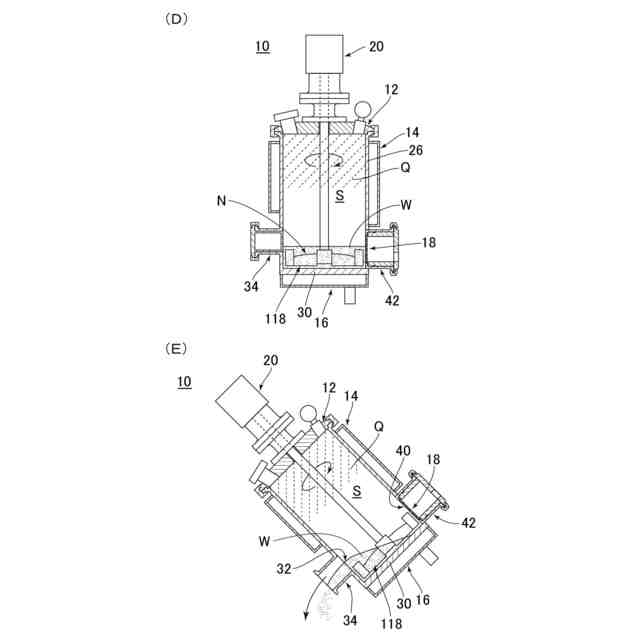 この多目的反応装置を用いて被処理物を処理する際には、反応工程(濾過準備工程)に続いて濾過工程が実行される。反応工程では、反応空間が濾過板および濾布よりも下方に配置され、反応空間に液体の被処理物が投入されて反応処理が行われる。反応工程において、被処理物の液面高さは、ギヤボックスの位置よりも下方に定められる。濾過工程では、反転機構で容器が上下方向に反転され、濾過板および濾布が反応空間よりも下方に配置される。そして、被処理物に含まれる固形物が濾布で捕捉されるとともに、濾液が排液空間を通して容器の外部に排出される。