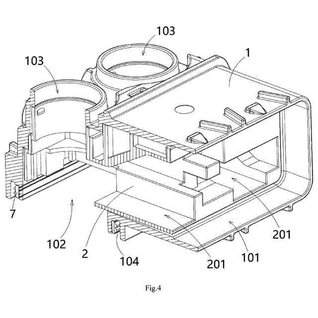 前記外側シールドシェル(1)の前記後部ポート(101)から前記外側シールドシェル(1)に挿入され、前記外側シールドシェル(1)の前記後部ポート(101)、前記底部開口部(102)、および前記取付けポート(103)と連通する挿入キャビティ(201)を有する内側絶縁ハウジング(2)と、