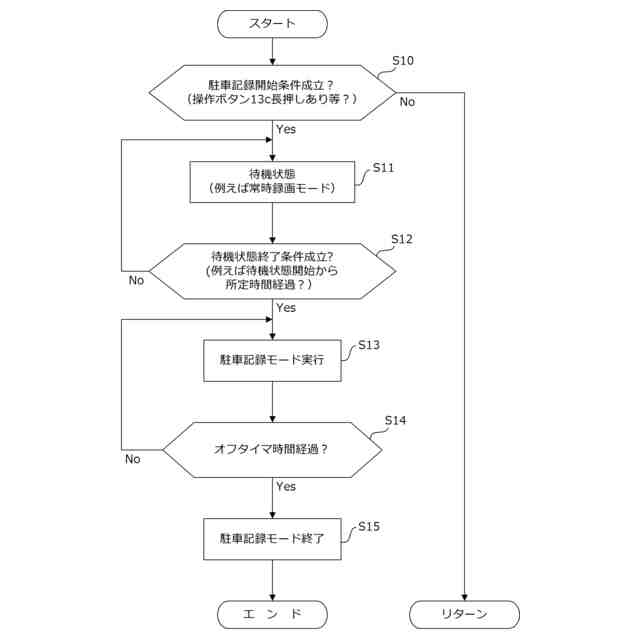 このように、駐車記録開始条件が成立した場合でも、駐車記録モードの駐車時用の録画を開始せずに待機する機能を有するから、ユーザにとって不要な録画が行われてしまうことを抑制することができる。このようにすると、利便性を高めることができる。駐車時用の録画を開始せずに待機することは、例えば、駐車記録モードでの動作は維持するが、駐車時用の録画を開始しないことをいうとよい。又は、駐車時用の録画を開始せずに待機している期間は、駐車記録モードの動作を停止して、他のモード(例えば、常時録画モード)で動作するようにしてもよい。