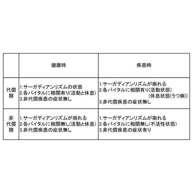 健康時と疾患時における、代償期と非代償期の一般的な状態を纏めた図である。
