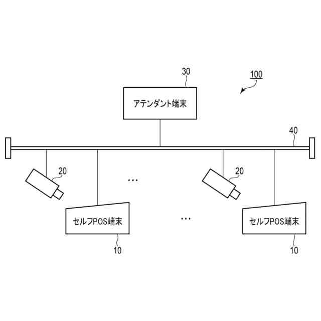 図1は、フルセルフ方式のチェックアウトシステム100を示す概略構成図である。チェックアウトシステム100は、複数のセルフPOS端末10、複数のカメラ20及びアテンダント端末30を含む。複数のセルフPOS端末10、複数のカメラ20及びアテンダント端末30は、ネットワーク40を介して互いに通信自在に接続する。例えば、ネットワーク40は、インターネット、携帯通信網及びLAN(Local Area Network)等の種々のネットワークのうちの1以上のネットワークで構成される。1以上のネットワークは、無線ネットワークを含んでもよいし、有線ネットワークを含んでもよい。なお、チェックアウトシステム100は、複数のセルフPOS端末10、複数のカメラ20及びアテンダント端末30のうちの少なくとも2つの電子機器を含むシステムを指すこともある。