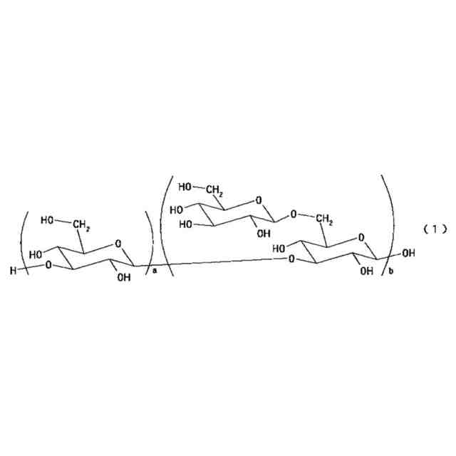 (ただし、aは、少なくとも20の数を表わし、bは、少なくとも1の数を表わす。ただし、aに対するbの比は0.6~0.95であり、aとbとの合計の数は、一般式(1)で表わされるβ-1,3-1,6-グルカンの質量平均分子量を1万~50万とする数である)