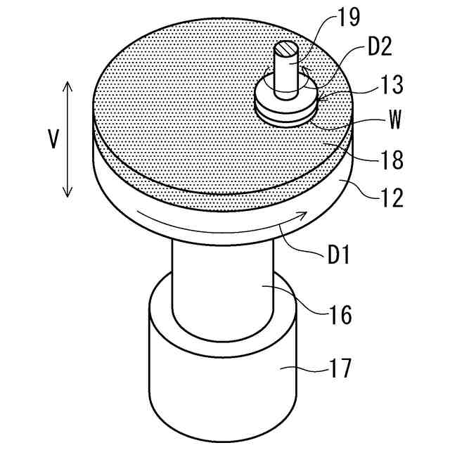 すなわち、CMPによる研磨は、回転する研磨ヘッド102に、ウエハWを一体回転可能に取り付け、ウエハWの一面を回転しているプラテン101上に所定の圧力で押し付け、ウエハWとプラテン101の間に、スラリーノズル103のスラリー吐出口103aから研磨剤と化学薬品との混合物である研磨材(スラリー)を供給することによって行っている。