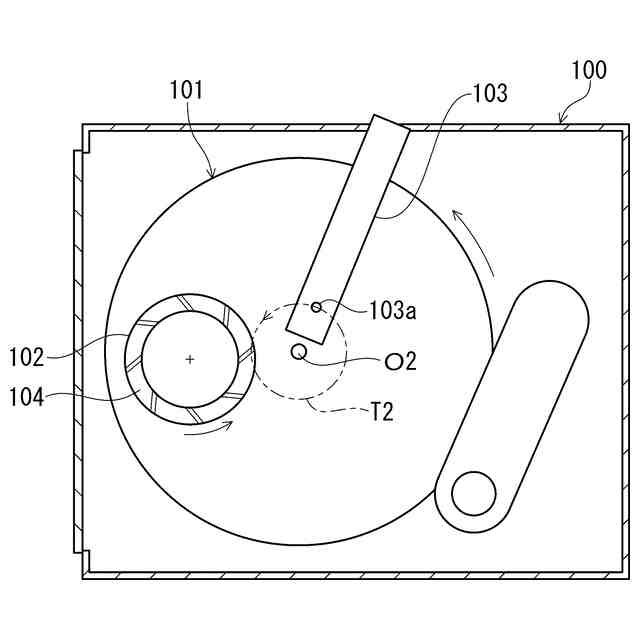 従来のCMP装置は、図8に示すように、加工室100内に、プラテン101と研磨ヘッド102とスラリーノズル103等が配置されている。そして、図示していない研磨加工されるウエハWは、研磨ヘッド102に取り付けられる。また、リテーナリング104とウエハWは、研磨ヘッド102と一体に回転する。研磨ヘッド102は回転しながら、同じく回転しているプラテン101上にウエハWの一面を所定の圧力で押し付け、スラリーノズル103は、スラリー吐出口103aからプラテン101上にスラリーを吐出し、プラテン101とウエハWの間にスラリーを供給する。スラリーノズル103のスラリー吐出口103aからスラリーを吐出する位置は、図8中に符号T2で示すプラテン101の回転軌道上である。これはプラテン101の回転中心O2に近い位置であり、研磨ヘッド102の外周で、かつ、リテーナリング104と交差する位置である。