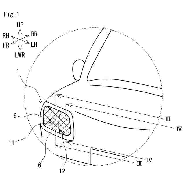 本発明の車両用灯具の具体例を、図面を参照して説明する。図中の同一符号は同一名称物を示す。各図面では、説明の便宜上、構成の一部を誇張又は簡略化して示す場合がある。図面における各部の寸法比も実際と異なる場合がある。図中、矢印FRは車両の前後方向の前側、矢印RRは車両の前後方向の後側、矢印RHは車両の左右方向の右側、矢印LHは車両の左右方向の左側、矢印UPは車両の高さ方向の上側、矢印LWRは、車両の高さ方向の下側を示す。